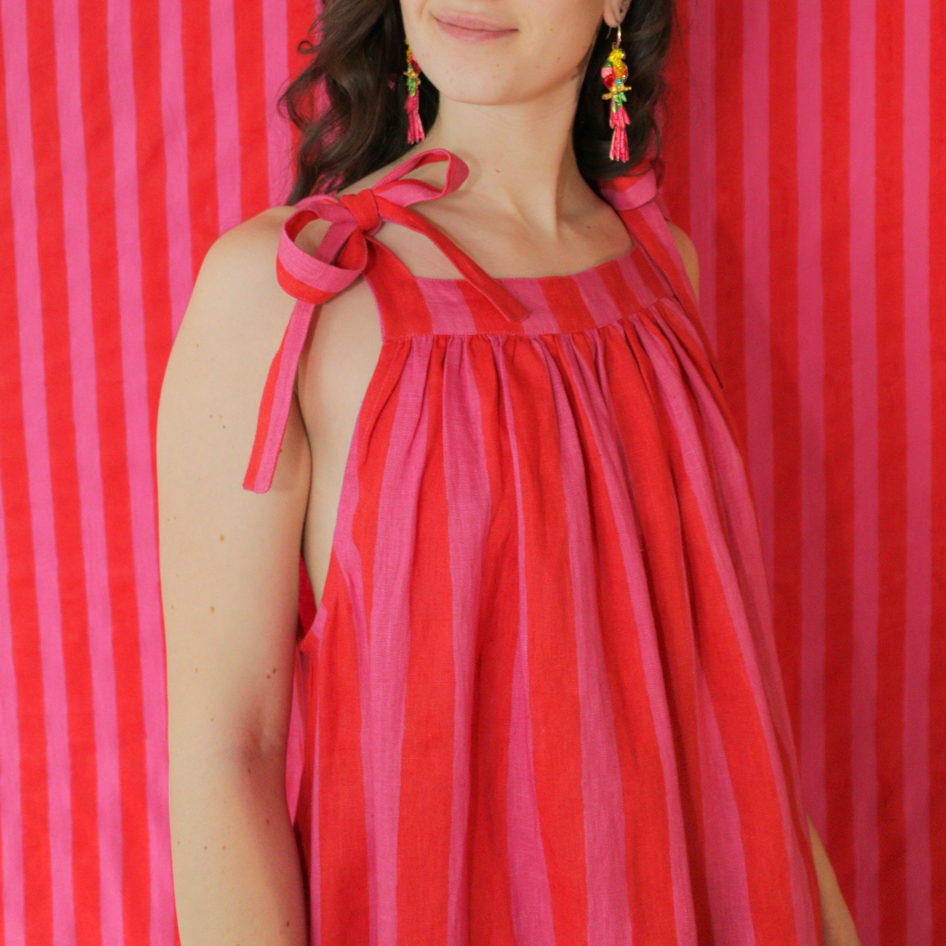 Mimi Linen Shoulder Tie Sun Dress in Pink and Red Cabana Stripe